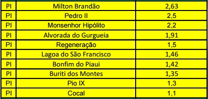 Na lista estão as cidades: Milton Brandão, Pedro II, Monsenhor Hipólito, Alvorada do Gurgueia, Regeneração, Lagoa do São Francisco, Bonfim do Piauí, Buriti dos Montes, Pio IX e Cocal. Outras 53 cidade do Piauí estão classificadas como em situação satisfatória.