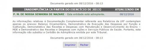 A decisão foi em atendimento ao que dispõe a DECISÃO Nº 935/15, em decorrente de inadimplência quanto ao envio das prestações de contas mensais referentes aos meses de janeiro a julho de 2016 e/ou com o não cumprimento da Decisão Nº 1.181-E, que trata sobre que trata sobre o Recolhimento das Contribuições ao Regime Próprio de Previdência Social (RPPS) Entre as prefeitura na lista, a de Nossa Senhora da Nazaré, administrada pelo prefeito Zé Henrique.