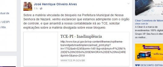 "Sobre a matéria vinculada de bloqueio na Prefeitura Municipal de Nossa Senhora de Nazaré, venho esclarecer que estamos adimplente com o órgão de controle, e que amanhã [sexta-feira] a nossa contabilidade irá ao TCE, solicitar explicações sobre a matéria divulgada sobre esse bloqueio" escreveu.