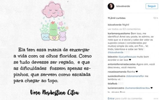 Com mais de 4 milhões de seguidores no Instagram, a atriz Isis Valverde compartilhou em sua página nesta quinta-feira (15/12), uma postagem em forma de banner da poetisa Lais Rosa, de Sigefredo Pacheco-PI. O post da atriz tinha mais de 11 mil curtidas nesta tarde.