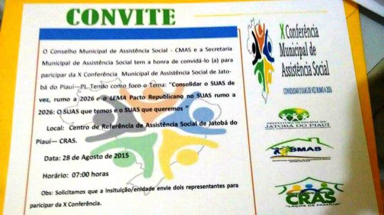 A prefeitura de Jatobá do Piauí através do Conselho Municipal de Assistência Social e da Secretaria Municipal de Assistência Social, realiza nesta sexta-feira (28/08) a X Conferência de Assistência Social do município.