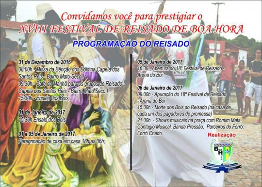 A programação para a edição deste ano começou no dia 31 de dezembro de 2016 com missa, café da manhã e ensaio dos bois. Do dia 01 ao dia 05 ocorre a peregrinação de casa em casa das 18h às 06h da manhã.