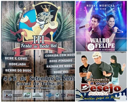 A 3ª. Festa do Bode Rei em Cocal de Telha nos próximos dias 4 e 5 de Setembro no Povoado Calengue terá duas grandes atrações em seu encerramento, no sábado dia 5. Consta ainda na programação muito forró pé de serra na Arena do Bode Rei durante o dia inteiro.