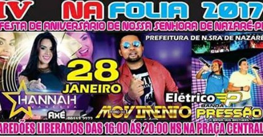A 4ª edição do Na Folia, tradicional Zé Pereira do município de Nossa Senhora de Nazaré será no próximo dia 28 de janeiro. A programação conta com arena para paredões liberada das 16h às 21h, em seguida tem festa com as bandas Hanna O furacão do axé, Movimento Elétrico e Banda Pressão Elétrico.
