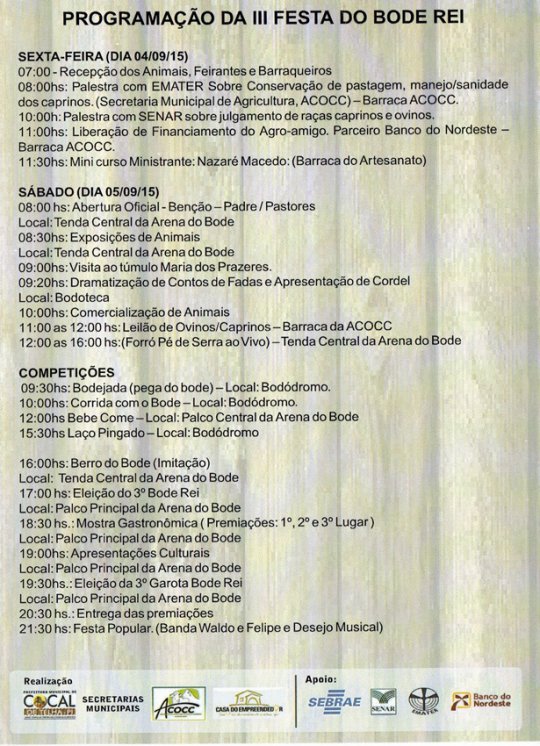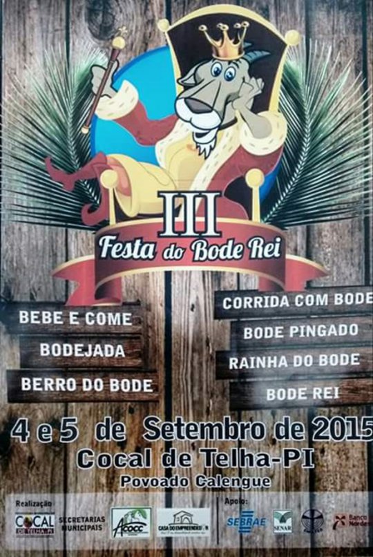A Prefeitura de Cocal de Telha e a Associação dos criadores de Caprinos e Ovinos de Cocal de Telha-Piauí(ACCOC) e a divulgaram a programação oficial da 3ª. Edição da Festa do Bode Rei. O evento que acontecerá no Povoado Calengue atrairá milhares de pessoas durante os dias 4 e 5 de Setembro.