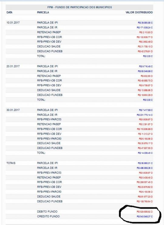 Na última segunda (30), a Receita Federal voltou a realizar descontos nas contas do município. Dos 238 mil liberados, 224 mil foram retidos. Ao total, o município recebeu 543 mil de FPM durante o mês, contudo, 529 mil foram sequestrados. O município terminou janeiro com 14 mil do repasse federal.