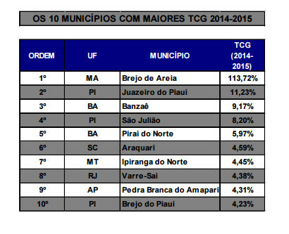 A lista do IBGE apresenta outras duas cidades do Piauí. São Julião é a quarta cidade com 8,20% de crescimento, enquanto Brejo do Piauí deve crescer 4,23%, sendo a 10ª da lista. Pirai do Norte – BA (5,97%), Araquari – SC (4,59%), Ipiranga do Norte – MT (4,45%), Varre-Sai – RJ (4,38) e Pedra Branca do Amapari – AP (4,31%) fecham as de cidades com maior a maior taxa média de crescimento geométrico (TCG).
