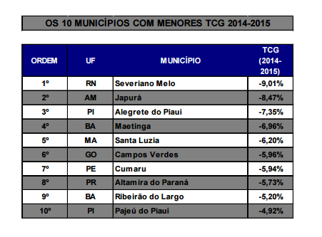 O IBGE também divulgou uma lista composta de 10 cidade com as piores taxas de crescimento entre 2014 e 2015. A cidade de Severiano Melo, no estado do Rio Grande do Norte, é a primeira da lista com -9,01%. Duas cidades do Piauí integram as estimas. Alegrete do Piauí é a terceira colocada com -7,35% e Pajeú do Piauí é a última, calculando -4,92%.