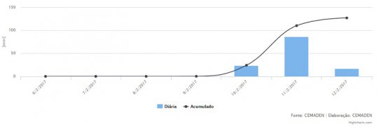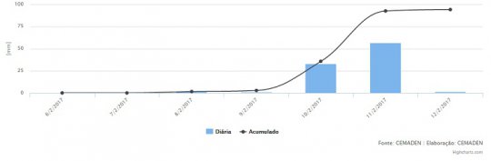 Os dados do Centro Nacional de Monitoramento e Alertas de Desastres Naturais (CEMADEN) mostram que Boqueirão acumula 163,8 mm de chuva nos últimos três dias. As precipitações na cidade tiveram início na sexta (11) com 24 mm. No sábado (11) o volume foi para 86,2 mm e no domingo (12) registrou 16,8 mm.