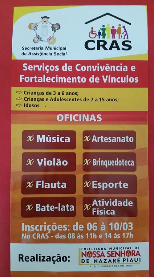 A Secretaria Municipal de Assistência Social de Nossa Senhora de Nazaré, comunica aos senhores país ou responsáveis que as inscrições dos Serviços de Convivência e Fortalecimento de Vínculos para as crianças de 03 a 06 anos, crianças e adolescentes de 07 a 14 anos e para os grupos da Melhor Idade, que as mesmas irão começar na Segunda-feira dia 06 / 03 a 10/03 nos horários de 08 às 11h e de 14 às 17h no CRAS.
