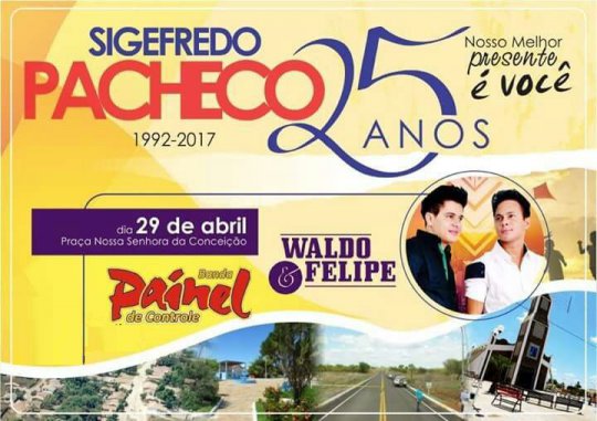 O município de Sigeffedo Pacheco completa 25 anos de emancipação política no próximo dia 29 de abril. Para comemorar a data, a prefeitura prepara uma programação que vai contenplar também as festividades pelo Dia do Trabalhador. As principais atrações da programação são um bingão popular e é a festa em praça pública com as Bandas Painel de Controle e Waldo e Felipe.