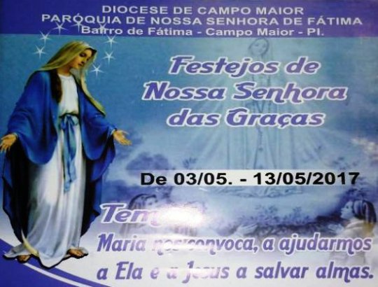 Os Festejos de Nossa Senhora das Graças, realizado pela Paróquia de Nossa Senhora de Fátima, terá sua abertura dia 03 de maio com a tradicional procissão que percorre diversas ruas do Bairro de Fátima aonde milhares de fiéis acompanham a imagem de Nossa Senhora das Graças.
