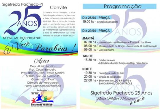 A prefeitura de Sigefredo está trazendo duas atrações para comemorar em praça publica o aniversario da cidade e festa do trabalhador, as bandas Painel de Controle e Waldo & Felipe estarão animando as festividades no município que esta completando 25 anos.