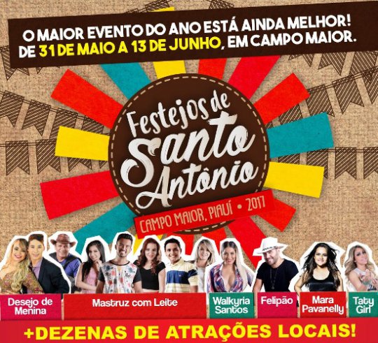 O evento que homenageia o padroeiro da cidade, Santo Antônio, conta com uma vasta programação que está atraindo milhares de pessoas. Novenas, leilões, apresentações culturais, vaquejada, festival junino, desfile de carros artigos, festival de hot-dog fazem parte da programação.