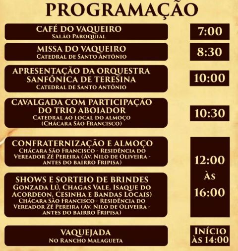 A festa começa com o café da manhã no Salão Paroquial em seguida a celebração da missa na catedral de Santo Antônio onde a vaqueirama vai receber a bênção do padroeiro da cidade, logo após haverá apresentação de uma Orquestra Sanfônica e saída dos vaqueiros em cavalgada pelas principais ruas da cidade até a Chácara São Francisco (residência do vereador Zé Pereira), no Bairro Fripisa, na Avenida Nilo Oliveira, onde acontecerá a confraternização e almoço da comitiva, com shows musicais e sorteio de brindes.