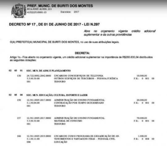 A prefeitura de Buriti dos Montes abriu “crédito adicional suplementar” no valor de R$ 357 mil no orçamento do segundo semestre deste ano. O valor é divido em dois decretos assinados pelo prefeito José Valmir Soares no dia 1 de junho e publicados nessa terça-feira no diário oficial dos municípios.
