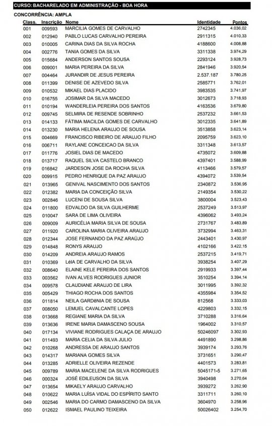 Com 4.036,02 pontos, a candidata Marcília Gomes de Carvalho foi a primeira colocada, seguida de Pabro Lucas Carvalho Pereira e Carina Dias da Silva Rocha. (Veja todos os nomes abaixo).