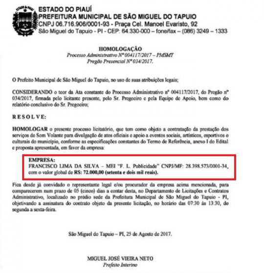 O prefeito interino de São Miguel do Tapuio, Miguel José Vieira Neto, homologou o processo administrativo 005117/2017, no qual realizou uma licitação na modalidade pregão presencial, para a contratação de um carro de som volante no valor de R$ 72 mil.