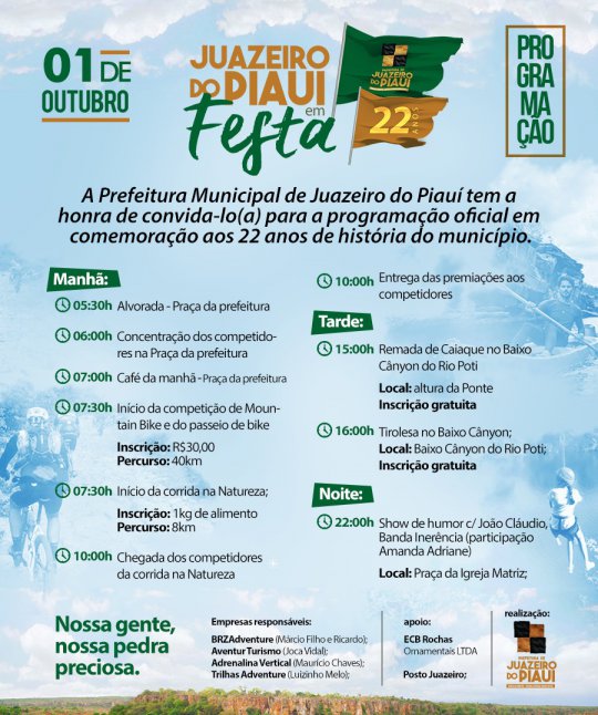 A cidade de Juazeiro do Piauí completa no próximo domingo, 1º de outubro, 22 anos de emancipação política. Em comemoração, o município recebe uma série de eventos durante todo o dia: atividades cívicas, competições esportivas, show de humor e atração musical.