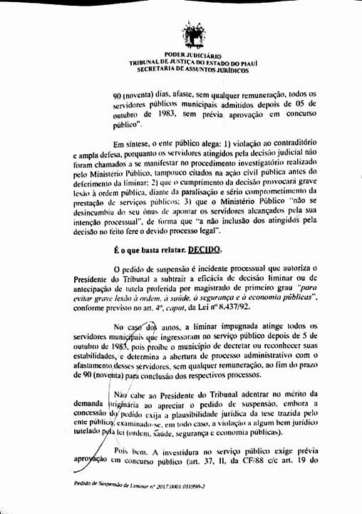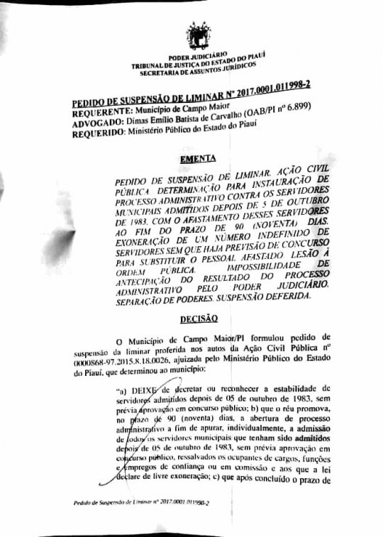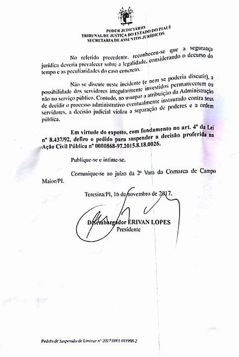 A suspensão da liminar de n° 0000868-97.2015.8.18.0026, que foi ajuizada pela prefeitura de Campo Maior foi analisada e julgada pelo desembargador do estado do Piauí, Erivan Lopes, que decidiu pelo deferimento do pedido de suspensão com base na lei n° 8.437/92.