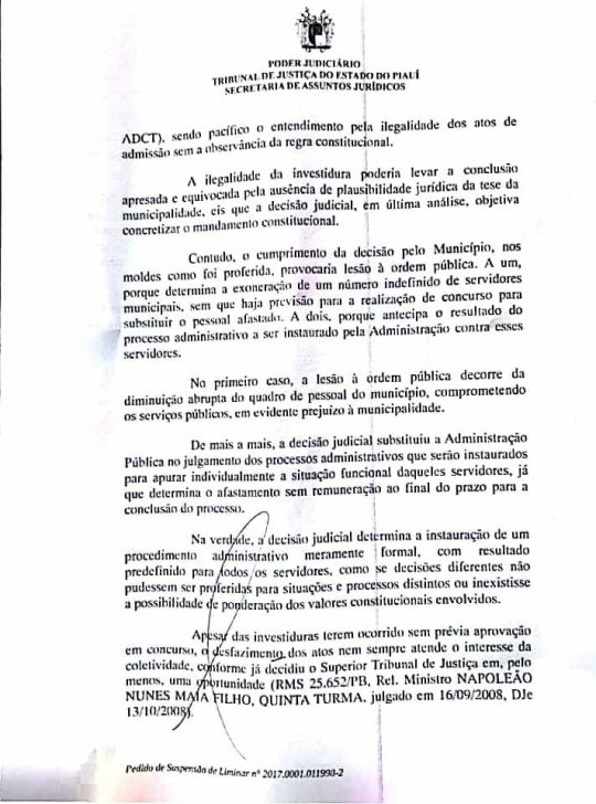 Na decisão, o desembargador também relata que as demissões de um número indefinido de servidores municipais, sem que houvesse a previsão de um concurso público para substituir o pessoal afastado, lesionaria a ordem pública do município, diminuindo abruptamente o quadro de pessoal do município e assim comprometendo os serviços públicos municipais.