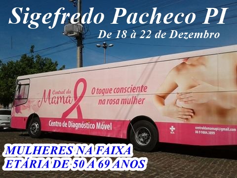 A SECRETARIA MUNICIPAL DE SAÚDE DE SIGEFREDO PACHECO PI, AVISA A TODAS AS MULHERES NA FAIXA ETÁRIA DE 50 A 69 ANOS QUE O ÔNIBUS DA MAMOGRAFIA ESTARÁ REALIZANDO O EXAME DA MAMA DE SEGUNDA A SEXTA FEIRA NOS DIAS 18 A 22 DE DEZEMBRO DE 2017 NA SEDE DO MUNICÍPIO.DOCUMENTOS NECESSÁRIOS PARA O ATENDIMENTO:COMPROVANTE DE RESIDENCIA- CARTÃO DO SUS- IDENTIDADE- CPF