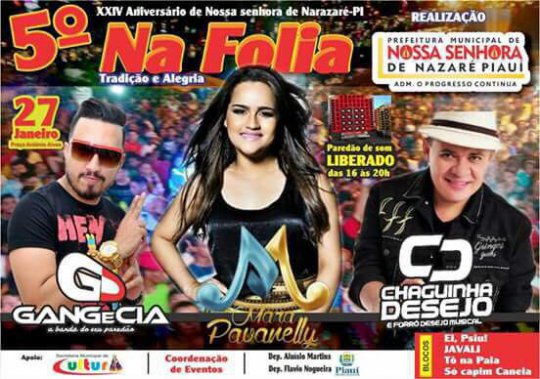 A prefeitura de Nossa Senhora de Nazaré anunciou nessa quarta-feira (03/01) a programação do 5ª NaFolia, que abre o período carnavalesco na região dos carnaubais e ainda comemora o aniversário do município. O evento acontece dia 27 de janeiro na praça principal da cidade.