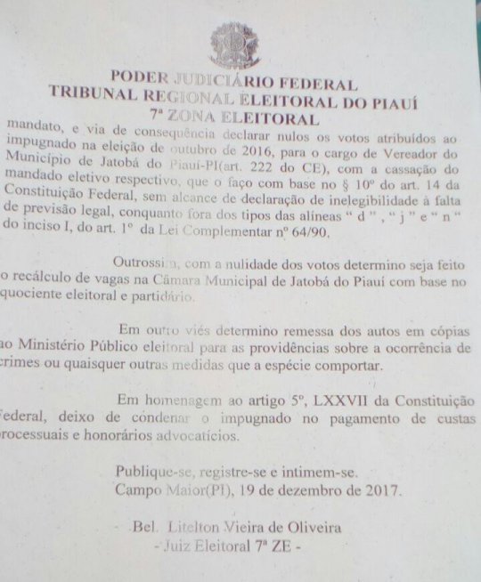 O Juiz de Direito Litelton Vieira de Oliveira, da 7º zona eleitoral de Campo Maior, decidiu sentença em Recursos Especial ao Processo 0000001-61.2017.6.18.0007 que trata da nulidade de votos do vereador de Jatobá do Piauí Agenor Gomes de França (PV), na eleição de outubro de 2016. A decisão é em primeira instância e cabe recurso. Com a decisão, Agenor deixará a cadeira na câmara de vereadores e o suplente Otoniel Luciano da Silva (PDT) da coligação “Quando o Povo Quer a Mudança Vem” assumirá a vaga.