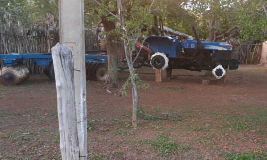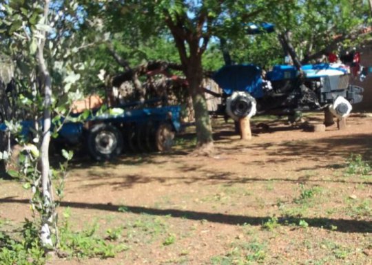 Nas fotos, o trator se encontra sustentado pelo que parece ser troncos de madeira, sem nenhum dos 4 pneus. O trator foi entregue aos agricultores na festa da melancia de 2013, pelo então prefeito Dalberto Rocha, quando tinha pouco mais de 2 meses de gestão.