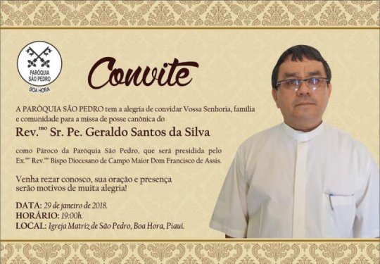 O Padre Geraldo será empossado como novo pároco da Paróquia de São Pedro, em Boa Hora-PI. A missa de posse será celebrada pelo Bispo Diocesano de Campo Maior, Dom Francisco de Assis no próximo dia 29 de janeiro.