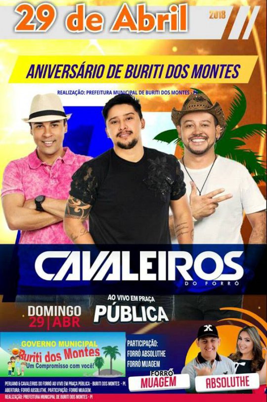 O município de Buriti dos Montes completa 26 anos de emancipação política no dia 29 de abril. Faltando ainda mais de 60 dias para o evento, a prefeitura já começa a organizar a programação. A banda já foi fechada e será Cavaleiros do Forró, que acaba de anunciar a volta do vocalista Jailson Santos que marcou época na banda.