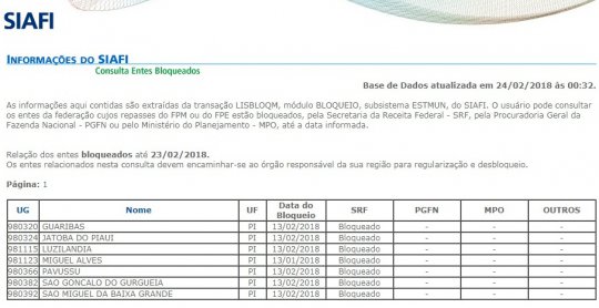 Os municípios do Piauí tiveram os bloqueios efetivados no dia 13 de fevereiro, com exceção de Miguel Alves que vem desde 13 de janeiro, e serão desbloqueados assim que os gestores resolverem as pendências financeiras. Enquanto não forem resolvidos, ou seja, os valores devidos sejam pagos, os repasses do FPM serão descontados automaticamente para abater a dívidas. Em caso de irregularidades na prestação de contas, precisa resolver o problema junto ao TCE-PI.