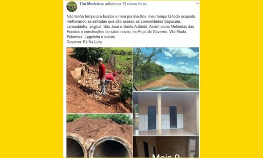 “Não tenho tempo pra boatos e nem pra insultos, meu tempo tá todo ocupado melhorando as estradas que dão acesso as comunidades Sapucaia, Carnaubinha, Angical, São José e Santo Antônio. Assim como melhorias das escolas e construções de salas novas no Poço do Governo, Vila Mada, Extremas, Lagoinha e outras”, postou.