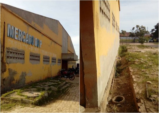 Fotos e relatos do local expõe as condições do Mercado Público, pichações, esgoto a céu aberto, piso destruído, grande quantidade de animais carniceiros e muita sujeira.