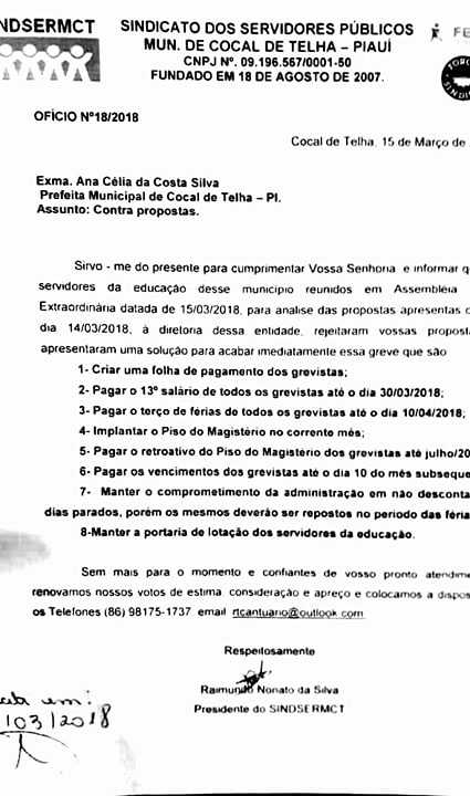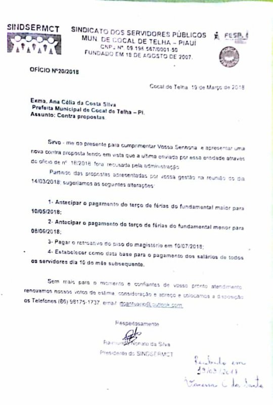 Segundo o presidente do sindicato, Professor Raimundo, na segunda-feira (19) o sindicato enviou à prefeitura um ofício onde constava as exigências da classe trabalhadora da educação para que fossem retomadas, já prefeitura relata que na última quarta-feira (14/03) eviou uma proposta irrecusável ao sindicato, com o pagamento de todos os servidores por igual.