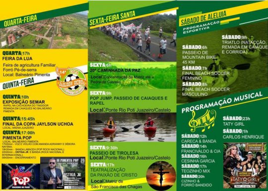 A programação começou ontem, quarta-feira, com feira da agricultura familiar, seguiu hoje com atividades esportivas e músicas ao vivo, mas o grande dia é mesmo no sábado, com atividades o dia todo na Barragem Pimenta, finalizando com shows musicais, A atração principal é Taty Girl.