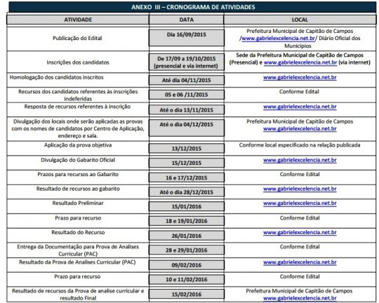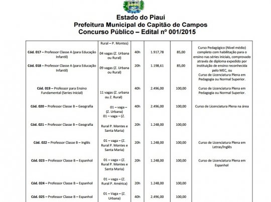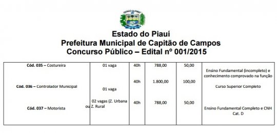 O município de Capitão de Campos lançou edital para realização de concurso público visando preenchimento de vagas em diversos cargos e níveis de ensino. O Concurso Público será realizado sob a responsabilidade da empresa Gabriel & Gabriel, Consultoria e Projetos Ltda, (Instituto Gabriel Excelência).