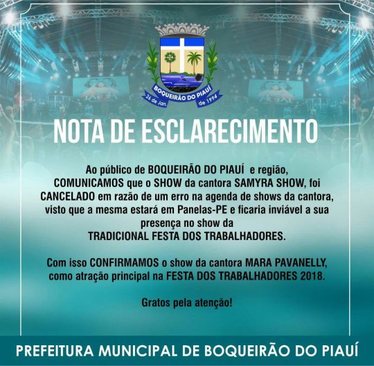 Em nota, a prefeitura informa sobre o cancelamento da atração e a alteração da mesma, pois a agenda da cantora Samyra Show entrou em desacordo com a festa do trabalhador no município e que esta estará no município de Panelas, no estado do Pernambuco.