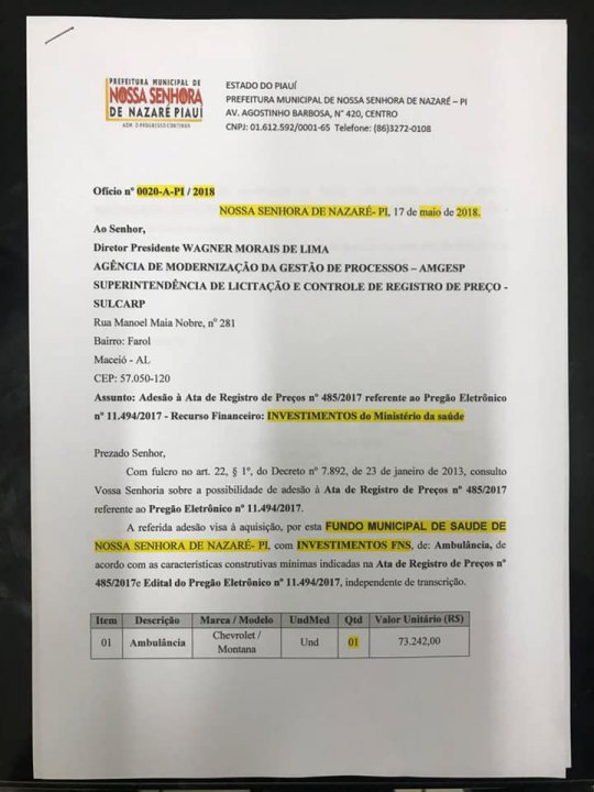 O oficio é destinado ao Diretor Presidente Wagner Morais de Lima da Agência de Modernização da Gestão de Processos – AMGESP e à Superintendência de Licitação e Controle de Registro de Preço – SULCARP, solicitando a inclusão do município na Ata de Registro de Preços n° 485/2017 referente ao pregão eletrônico n° 11.494/2017.