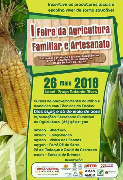 A prefeitura de Nossa Senhora de Nazaré e parceiros como Sindicatos dos trabalhadores rurais e associações, realiza nos dias 24, 25 e dia 26 a “I Feira da Agricultura Familiar e Artesanato” do município.