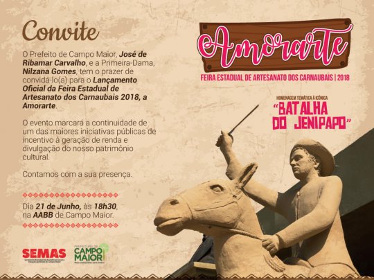 A prefeitura municipal de Campo Maior, representada pelo prefeito José de Ribamar Carvalho, e da primeira-dama e secretária de assistência social do município, Nilzana Gomes, lançará oficialmente na próxima quinta-feira (21/06) na AABB a Feira de Estadual de Artesanato dos Carnaubais, a Amorarte 2018.