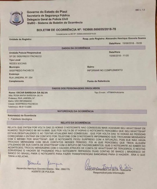 O prefeito municipal de Sigefredo Pacheco, Oscar Bandeira, registrou nesta sexta-feira (15/06) um boletim de ocorrência onde oficializa uma denúncia de invasão ao seu aplicativo pessoal de mensagens whatsapp. Uma movimentação estranha teria gerado a desconfiança.