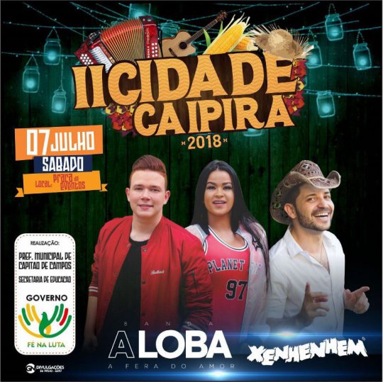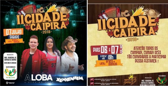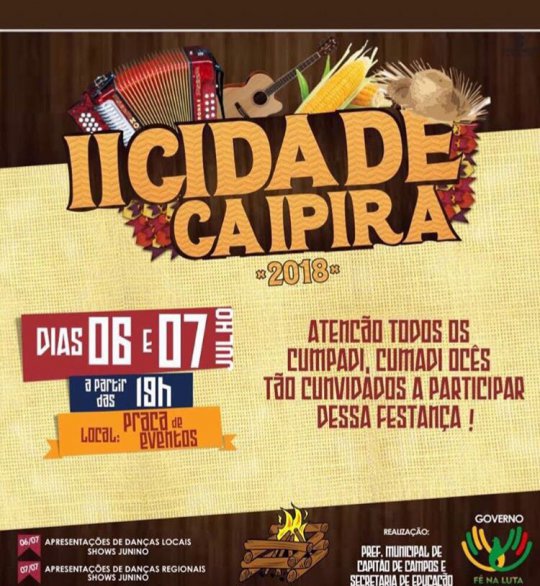 A prefeitura de Capitão de Campos divulgou a programação da 2ª edição da “Cidade Caipira”, o festival junino que foi um sucesso em 2017. O evento acontece nos dias 06 e 07 de Julho e vi contar com uma superestrutura, praça de alimentação, apresentações culturais e shows.