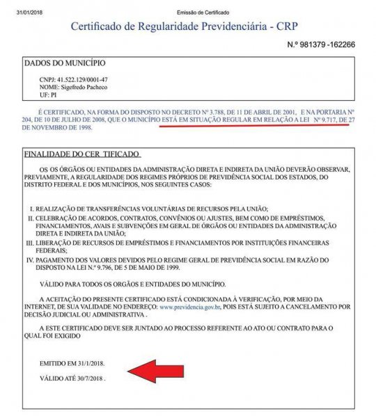 Em relação a postagem do colega Erinaldo Camelo, onde o mesmo relata irregularidades na CRP, Certificado de Regularidade Previdenciária do Fundo de Previdência do município de Sigefredo Pacheco – PI, como o mesmo mostrou na postagem, a CRP encontra-se válida até 30 de julho de 2018, portanto os itens que são indicados no campo situação mostra apenas que os mesmos devem ser sanados até a data de validade da CRP (30 de julho de 2018), para que possamos continuar com ela válida. E é isso que estamos fazendo, informo ainda que estes itens já estão em processo de finalização. Portanto, se temos a CRP ativa o Regime de Previdência do município encontra-se regularizado.