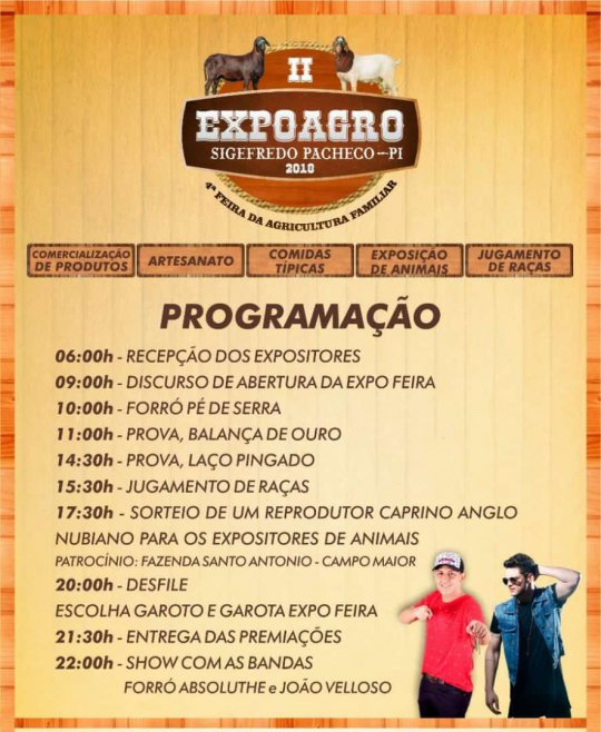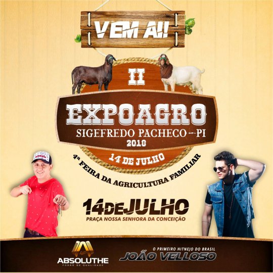 A 2ª edição da Feira e Exposição “ExpoAgro” e 4° Feira da Agricultura Familiar da cidade de Sigefredo Pacheco, cidade localizada a 190 km ao norte de Teresina, acontecem no dia 14 de julho na Praça Nossa Senhora da Conceição.