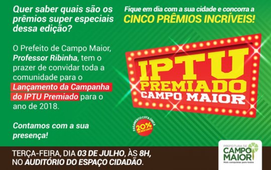 A Prefeitura de Campo Maior irá lançar na próxima terça-feira, dia 03 de julho, “IPTU Premiado 2018”. O evento será no auditório do Espaço Cidadão, às 08hs da manhã.