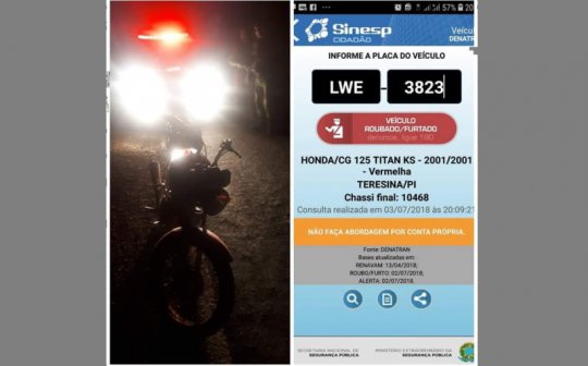 Policiais do GPM de Nossa Senhora de Nazaré, pertencente a 1ª CIA do 15° Batalhão de Polícia Militar, durante patrulhamento na rodovia PI-320 na noite desta terça-feira (03) conseguiram recuperar uma moto Honda CG 125 Titan que tinha restrição de furto/roubo.