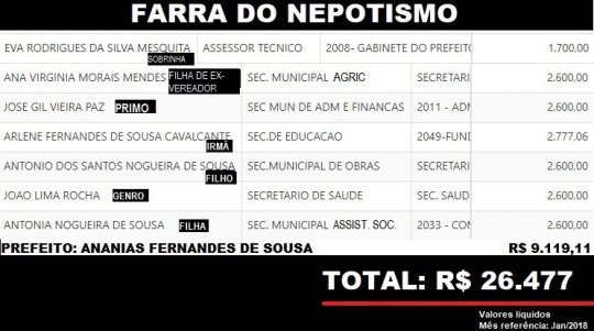 No final do mês somente a família do Prefeito leva dos cofres públicos R$ 26,777,00 mil reais líquidos. Este é um dos mais emblemáticos casos de farra do nepotismo que ocorre em diversas prefeituras do Piauí onde o gestor aproveita a oportunidade dada pelo povo para favorecer apenas sua família desacreditando até mesmo na capacidade de outros munícipes.