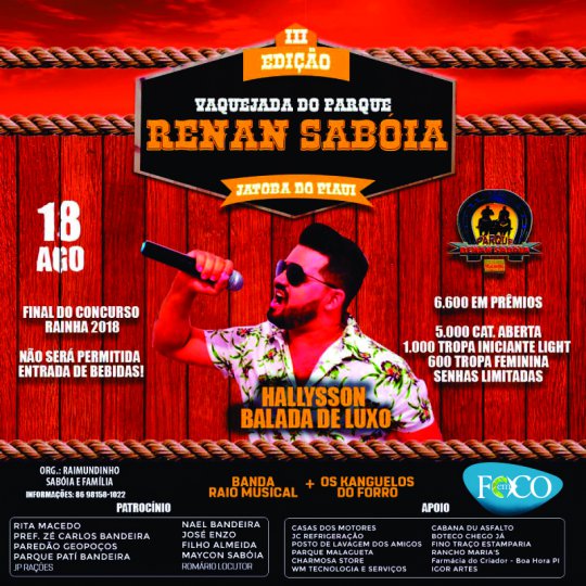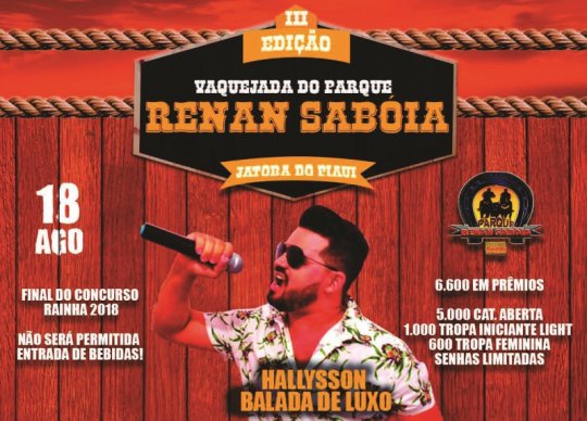 A 3ª grande vaquejada do Parque de Renan Saboia em Jatobá do Piauí acontece neste sábado, no dia 18 de Agosto, iniciando já a partir da 15:hs. Serão distribuídos R$ 6.600,00 em prêmios em três categorias: aberta, iniciante light e Tropa Feminina.