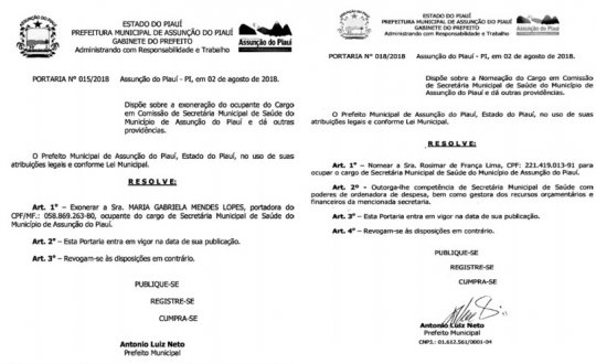 Portarias de exoneração e nomeação, respectivamente, das secretárias de saúde
